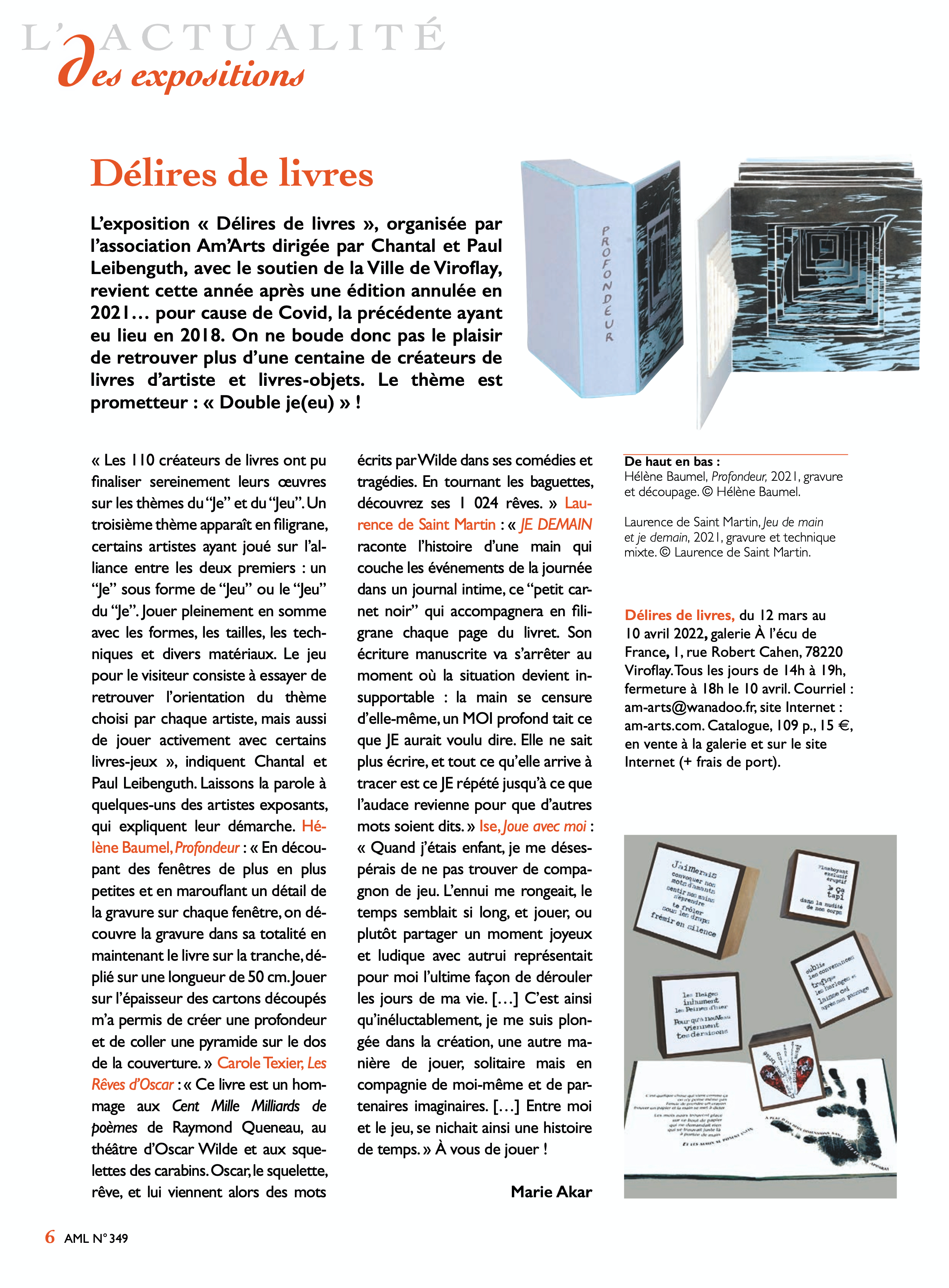 J’ai imaginé deux livres originaux tant par leur conception que par leur contenu pour l’exposition Délires de Livres 2022. « Je Demain » & « Jeu de Main » ont retenu l’attention et ont été mentionnés dans la revue Art et Métiers du Livre ainsi que dans le journal de la ville de Viroflay annonçant l’événement.